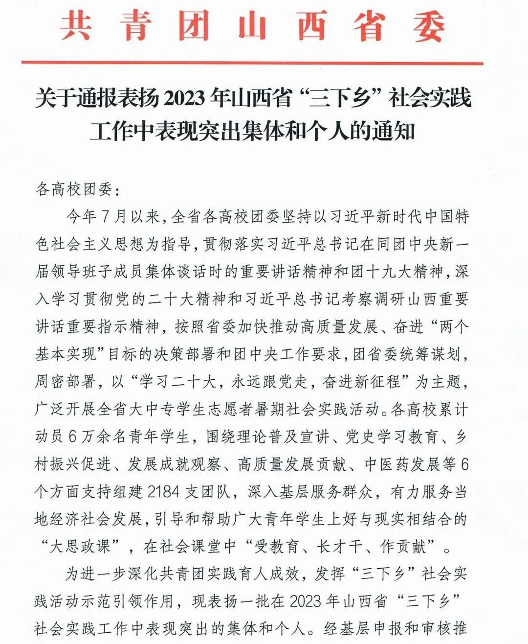 今年7月以来,我院坚持以习近平新时代中国特色社会主义思想为指导,以“学习二十大,永远跟党走,奋进新征程”为主题,开展大学生志愿者暑期“三下乡”社会实践活动。近日,共青团山西省委发布《关于通报表扬2023年山西省“三下乡”社会实践工作中表现突出集体和个人的通知》,我院“文新小队”荣获优秀团队称号。2021级网络与新媒体班高子茹同学荣获优秀个人称号。