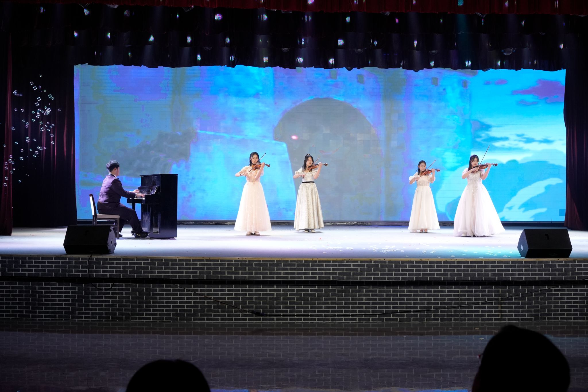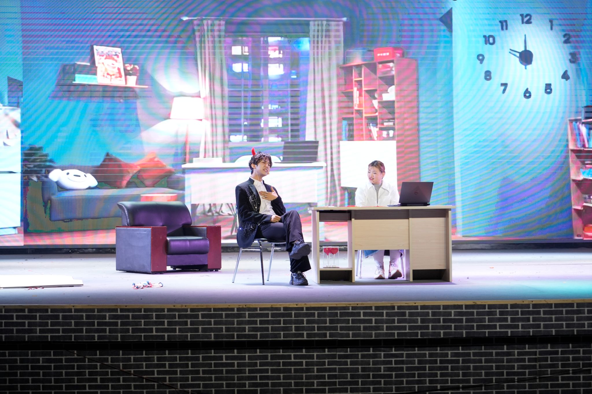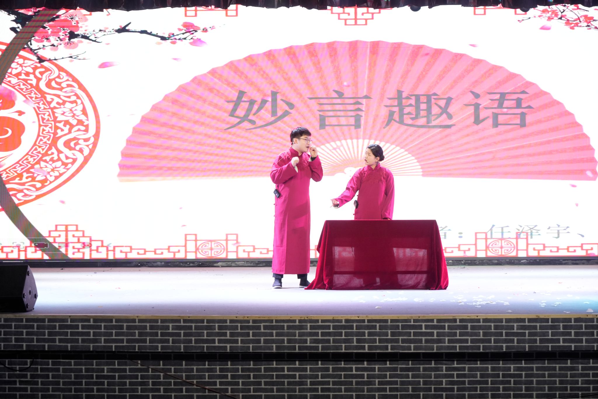 在壮观、绚丽的学院激光秀和学生活动精彩视频开场后,晚会正式开始。精彩的啦啦操表演,充分展现了连续四年获得学校啦啦操精英赛第一的冠军队伍风采。民乐表演《茉莉花》和相声《妙语连珠》充满中华民族传统文化特色,展现了青年学子对中国传统文化的喜爱和传承,更体现出学院坚定文化自信,秉持开放包容,坚持守正创新的文化育人原则。说唱表演《水晶》、街舞表演《YES or YES》和西洋乐器合奏《浴火重生》呈现出跨文化差异带来的文化融合氛围。小品《时间都去哪了》以现代社会大学生被手机“绑架”的真实演绎来提醒同学们做好时间规划。小品《平行时空饭店》则以超时空意象演绎出不同选择下的人生道路,提醒我们无论结果好坏,都要坚定自己的初心。