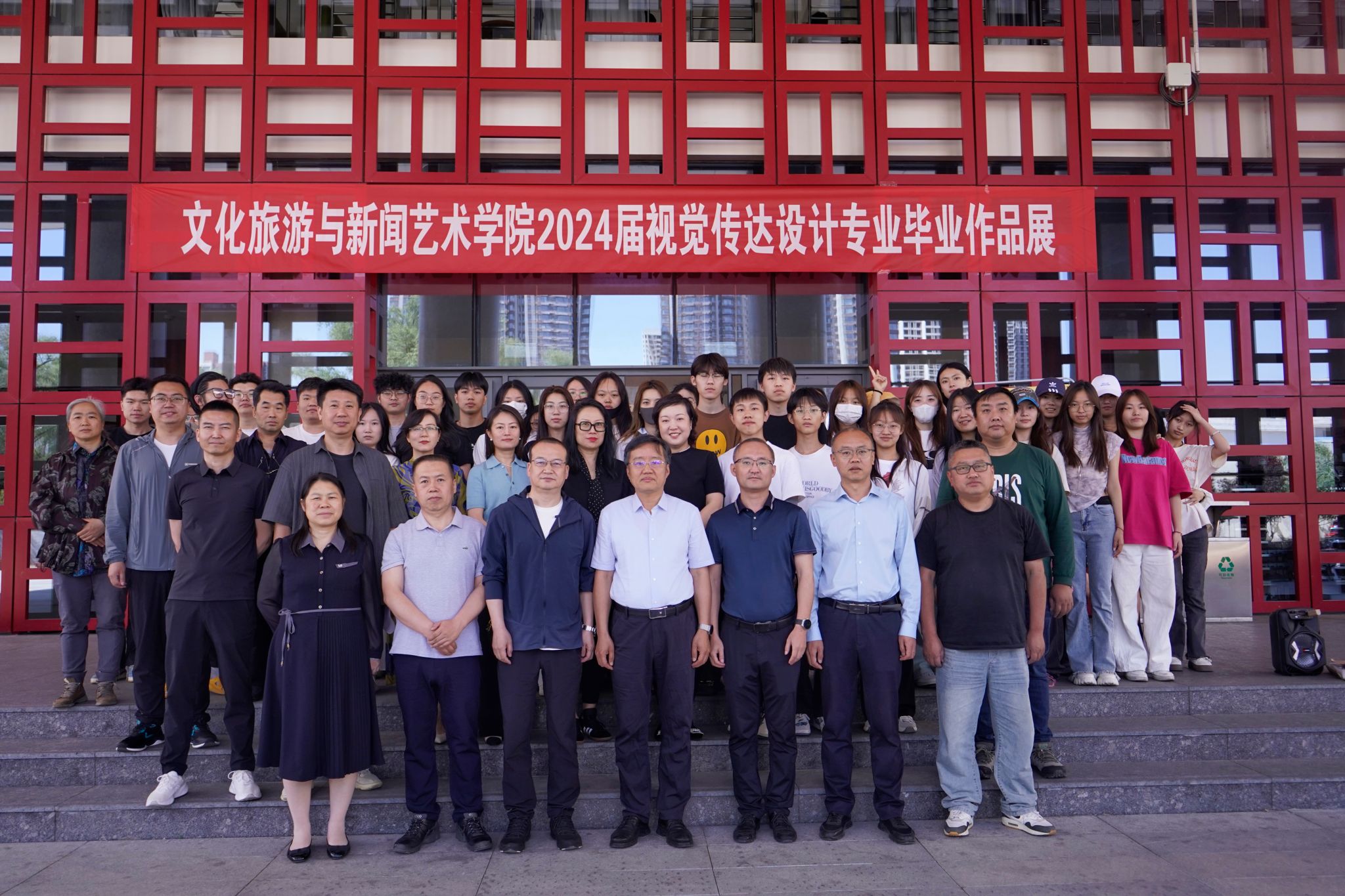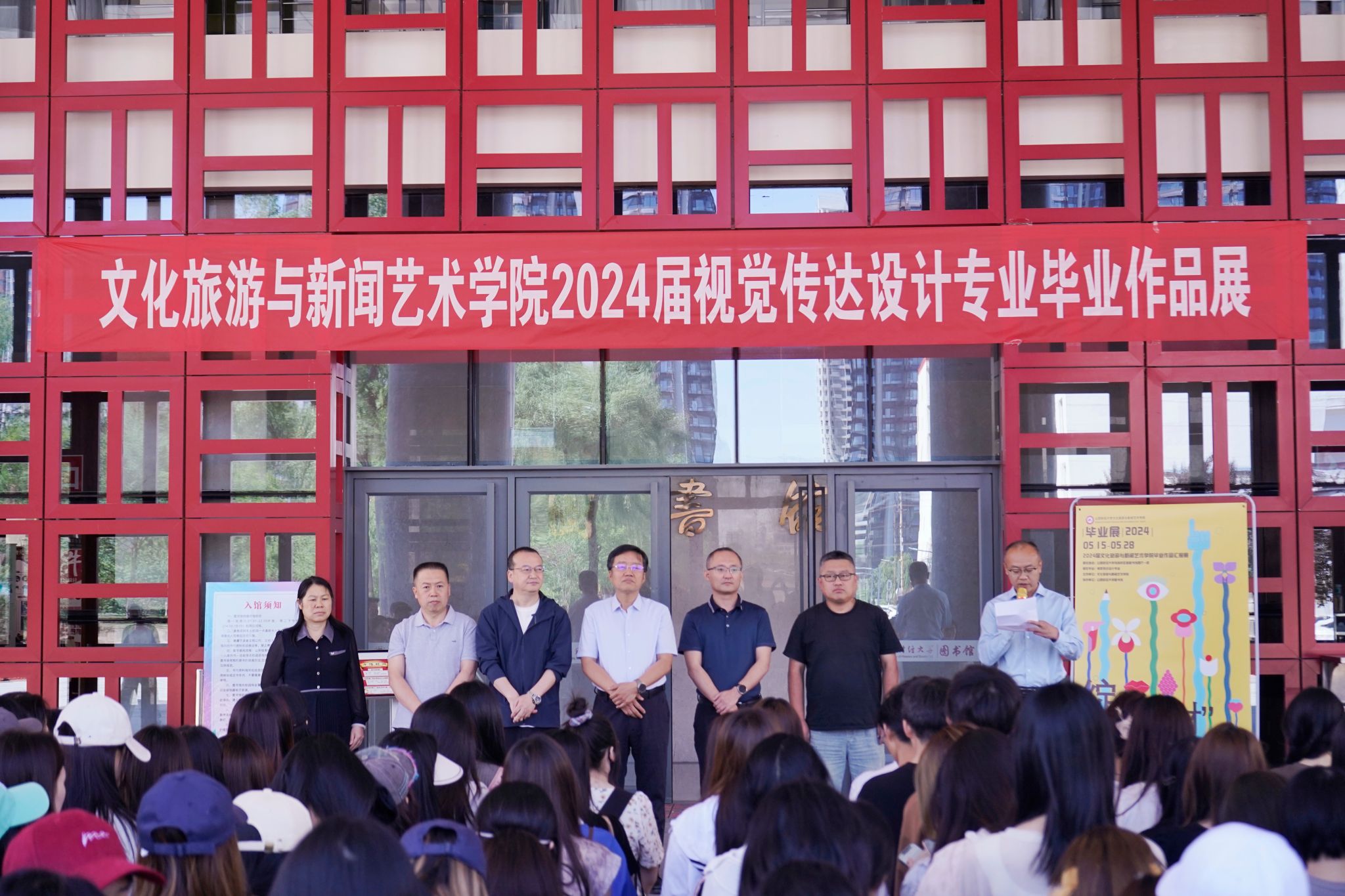 张校长宣布“必发集团welcome欢迎光临 2024 届视觉传达设计专业毕业作品展正式开幕”,并与出席开幕式的领导及必发集团welcome欢迎光临视觉传达设计专业全体师生一起合影留念。