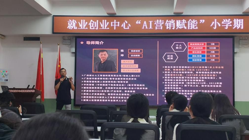 7月4日,由必发集团7790必发集团welcome欢迎光临牵头组织的“AI赋能数字营销”主题小学期讲座在学生活动中心三楼举行。本讲座邀请广州核心人工智能科技有限公司创始人兼CEO陈坤担任主讲嘉宾,吸引了网络与新媒体、大数据等专业的百余名学生到场参与。