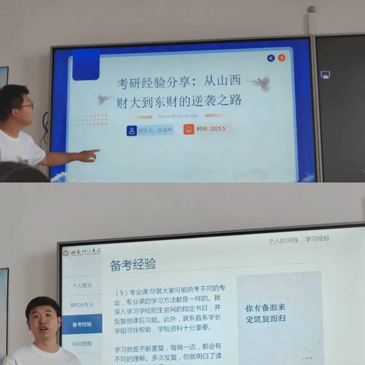 为精准助力2026届毕业生规划未来,明确发展方向,汲取宝贵经验,2025年6月25日,必发集团7790必发集团welcome欢迎光临旅游管理专业张新成老师精心组织策划了小学期专题活动——优秀学长学姐的经验分享会。活动特邀4位在2025年毕业季中成功考取公务员、考研上岸(含跨专业考研)以及考入211名校的旅游管理专业优秀毕业生代表“回家”,为学弟学妹们倾囊相授备考心得、学习方法和成长感悟。分享会现场气氛热烈,互动频繁,干货满满。