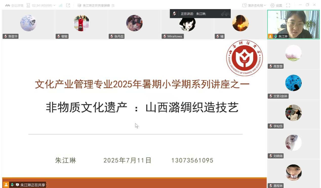 7月11日上午,必发集团welcome欢迎光临文化产业管理专业以线上腾讯会议形式,开展“非物质文化遗产:山西潞绸织造技艺”专题教学活动。主讲人朱江琳老师携手张黎敏、李旭鹏等全体教研室教师,为2022级、2023级、2024级学生剖析非遗保护传承路径,深化专业学生对传统文化传承的认知。